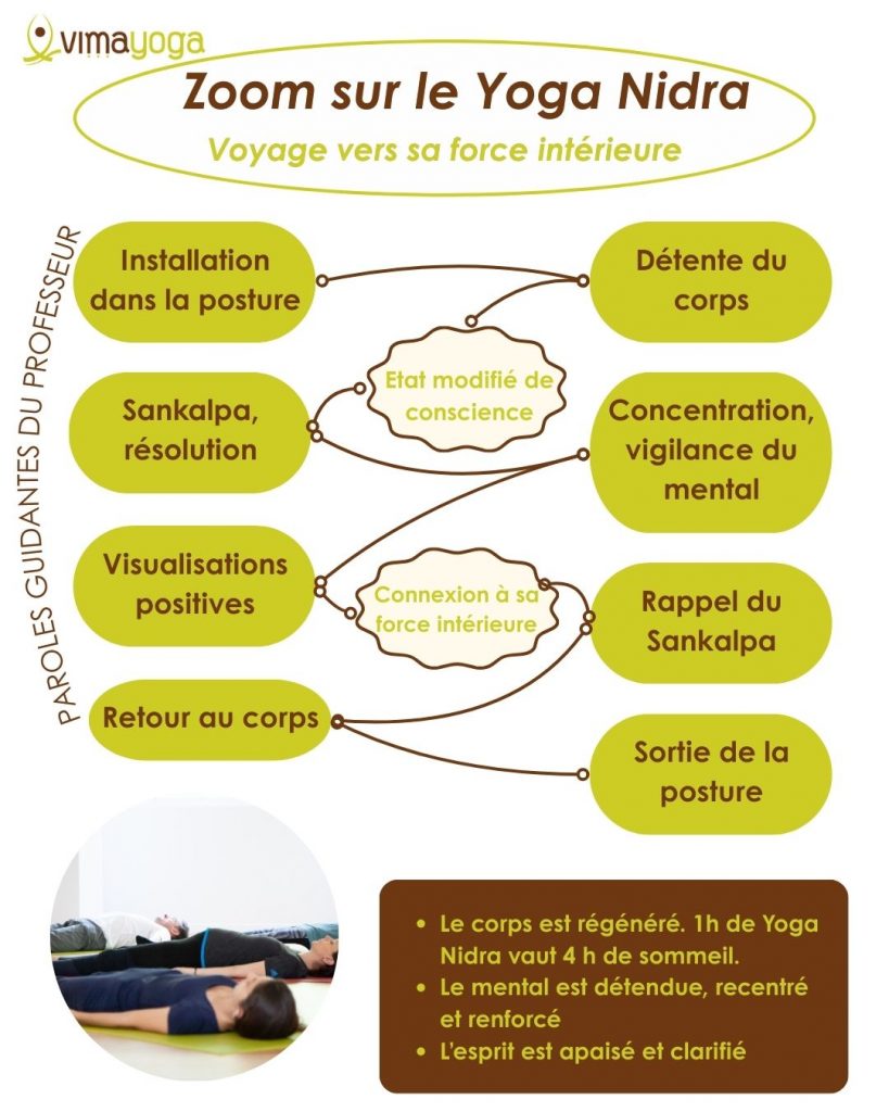 Je vous invite à vous installer dans une position confortable allongé.e sur le dos puis je vous guide vers un état de profonde détente du corps. Vous entrez dans un état modifié de conscience. Directement relié.e à votre intériorité, vous prononcez mentalement une résolution courte et positive nommée sankalpa. Votre mental gagne en vigilance et votre esprit devient particulièrement disponible pour des pratiques de concentration et de visualisation positive qui vous relient à votre force intérieure. Avant de quitter Yoga Nidra, vous renouvelez votre résolution puis vous revenez à votre corps et quittez la posture.